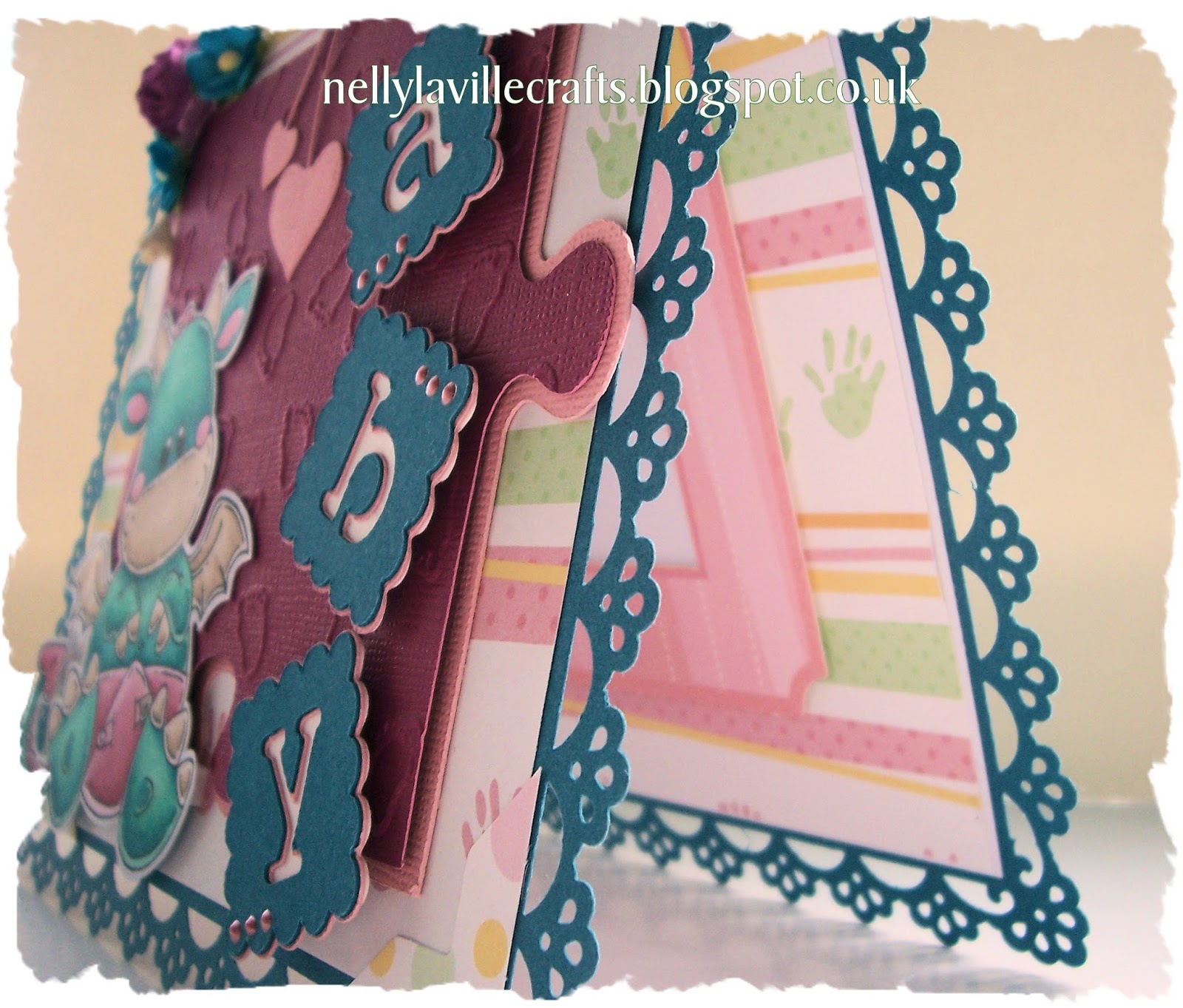 How cute is this image!?! Can you see the little embossed feet on the giant jigsaw piece? I have used my Cricut to cut the jigsaw shape and have embossed it with the little feet.